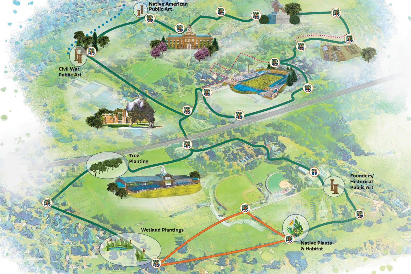 Each stop will have a different feature, such as a public art station, a historical plaque, or a conservation garden. Some have already been implemented, such as the butterfly garden that lies behind the senior apartments. However, other spots are preexisting— such as areas that will highlight Bucknell’s natural beauty.